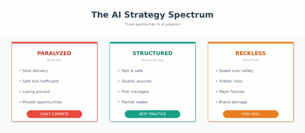 Organizations mastering the human-AI feedback loop operate in a different competitive universe. They move faster than companies paralyzed by AI fear and safer than companies practicing reckless adoption. This structured collaboration delivers AI’s speed and scale without catastrophic errors – maintaining quality while reducing costs and timelines.